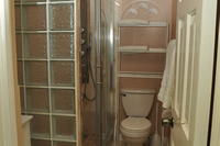 Modern walk-in shower stall with rainfall shower head and jet-streams